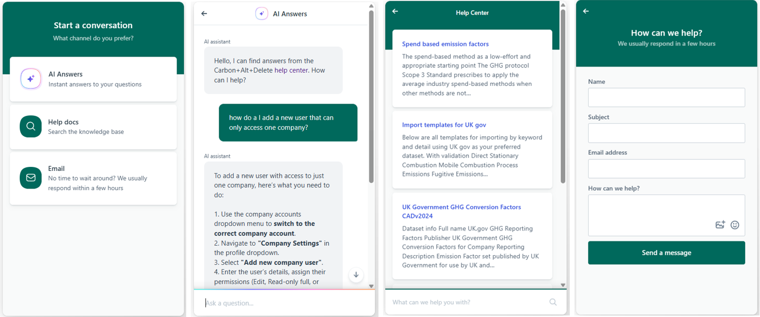 The in-app support features are on top of our existing support channels. You can of course still email us directly at support@carbonaltdelete.eu. We do however strongly encourage you to take advantage of the AI Answers feature as it will provide immediate answers that we at Carbon+Alt+Delete will continously improve on.