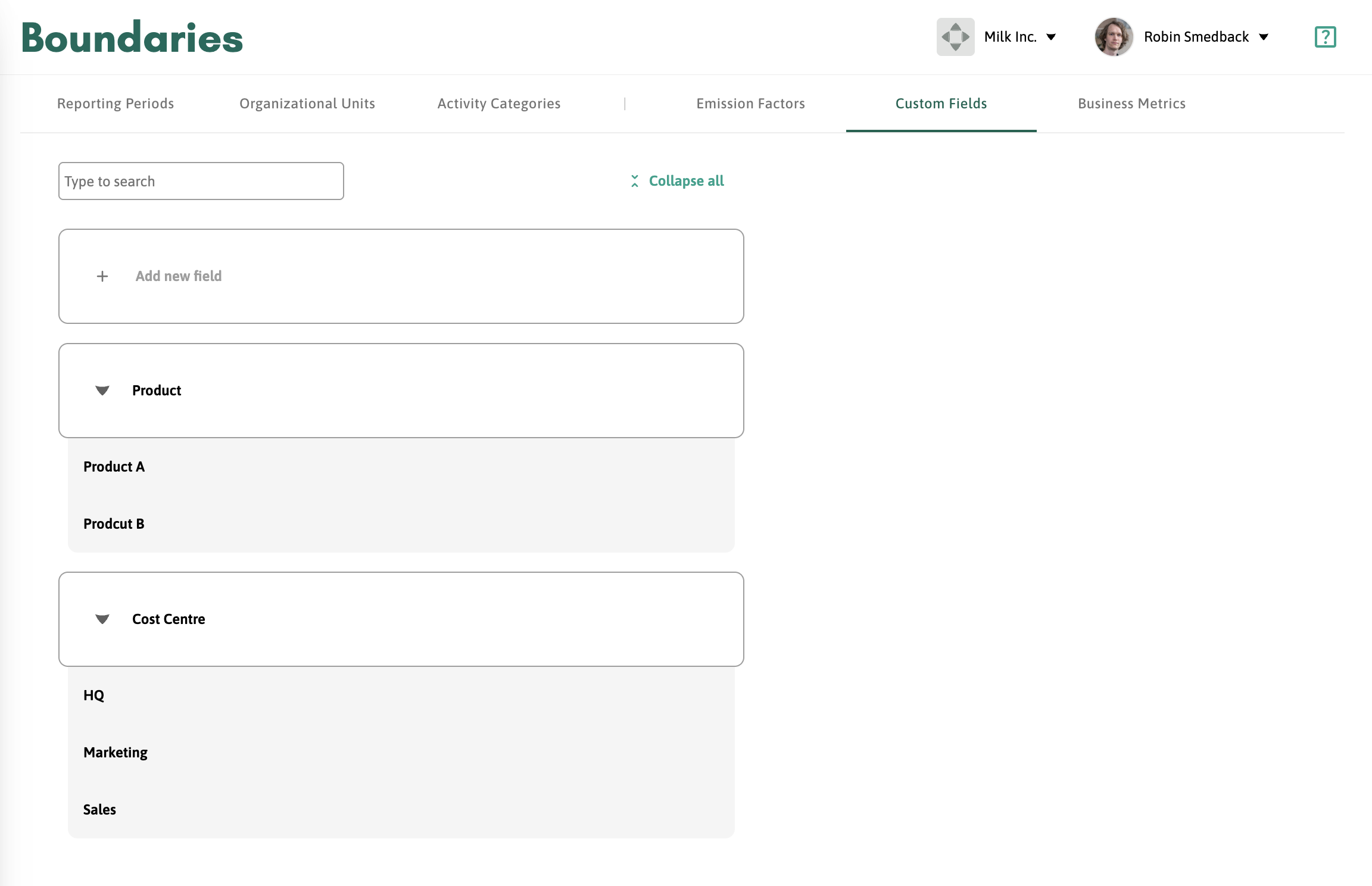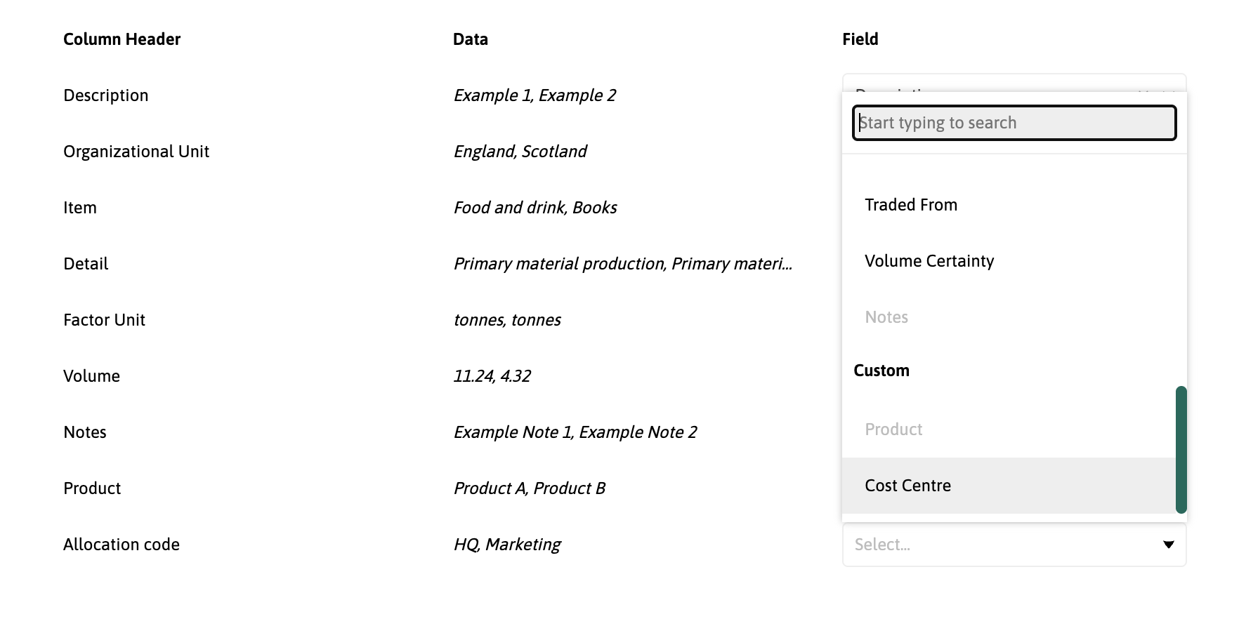 In the above image you can see that we have two different custom fields: Product and Cost Centre. When importing data, any column and value can be mapped to these fields and values.