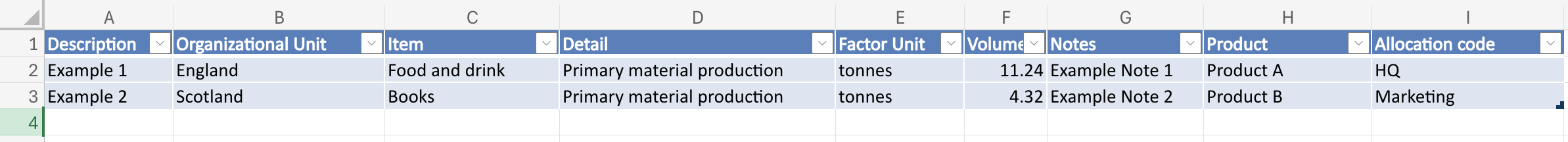 In the sheet above (based on on of our templates), we have added two additional columns to the right: Product and Allocation code. Note that there is not an exact match between one of the columns and the custom fields.