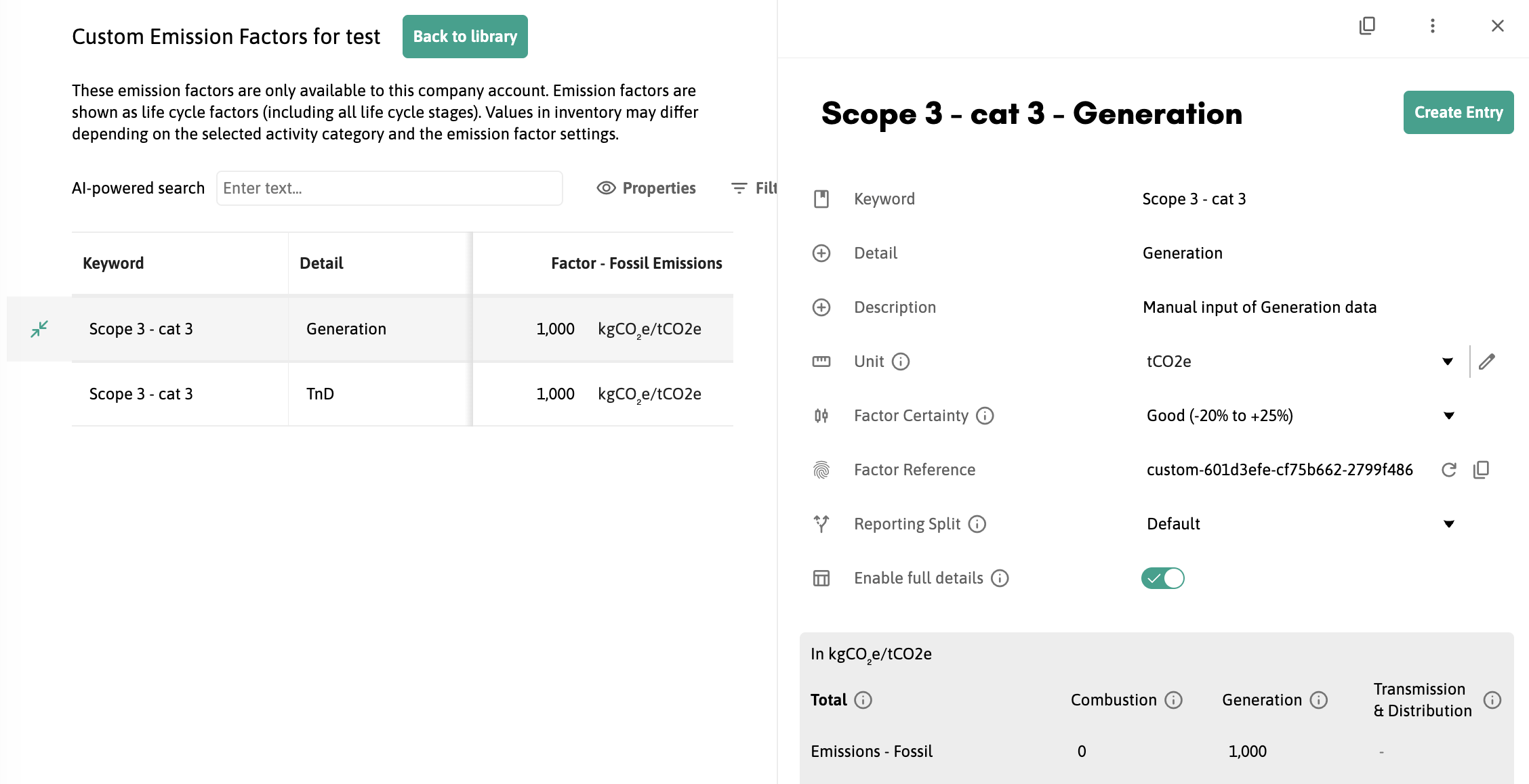 Next, give your emission factors an appropriate keyword, detail, description, and a custom unit of tCO2e. You will then enable full details and input 1000 in Generation in the first emission factor and 1000 in Transmission & Distribution in the second. Input no other emissions data especially not in the Combustion column as we don't want emissions showing up anywhere but in energy supply.