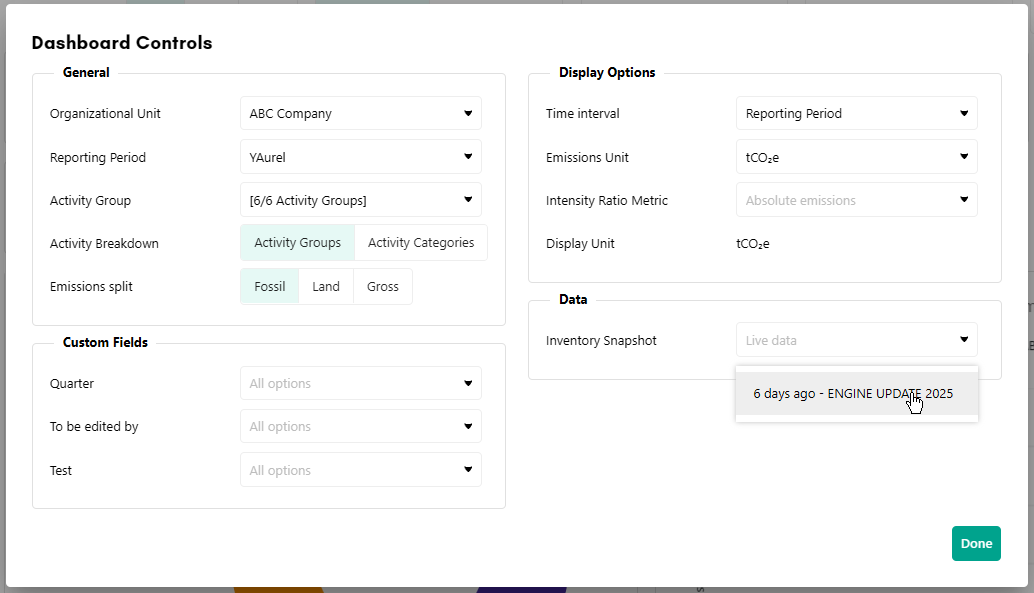 After the Engine update, you may want to review how your calculated emissions have changed. To support this, we have introduced Inventory snapshots. From now on, when there is an update that affects emission factors or calculation methods, the system will create an Inventory snapshot of your data before the change is applied.