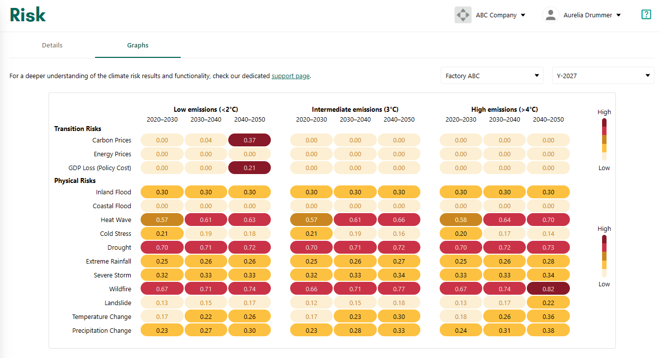The graphs show risk information for different climate scenarios, time periods and risk factors, including transition risks such as carbon and energy prices, and physical risks such as flooding and fires.