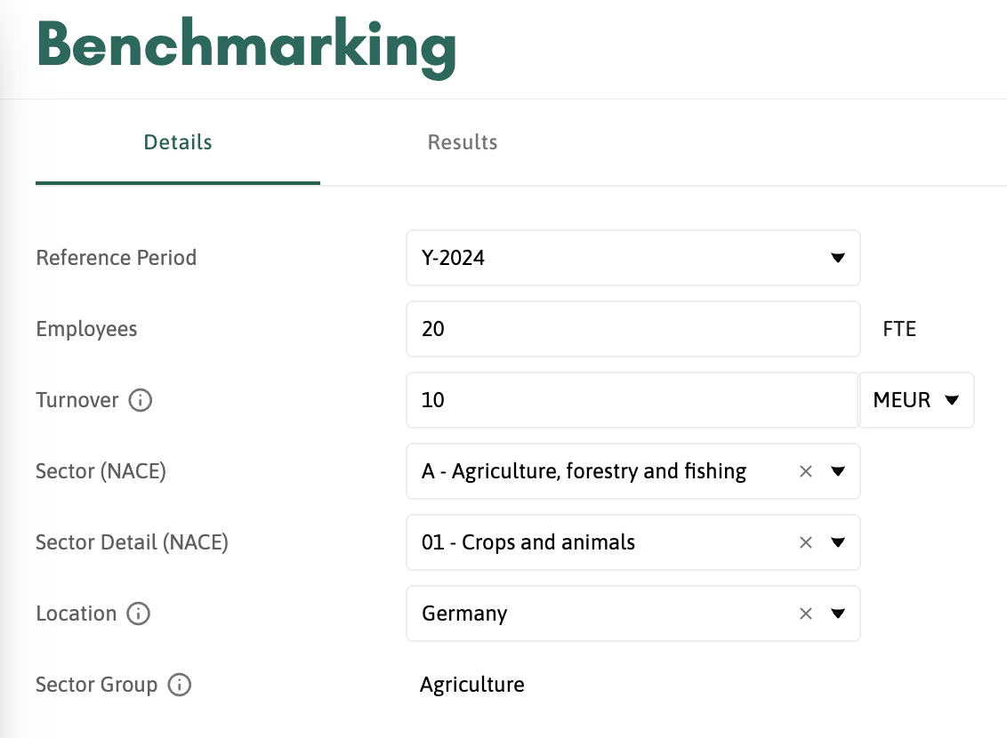 Benchmarking can be found under the Analyse section. In the first tab, Details, you fill in the company information that will be the base for the benchmark comparison. You need to fill in all of the fields to get results (Sector Group is filled in automatically based on the Sector and Sector Detail).