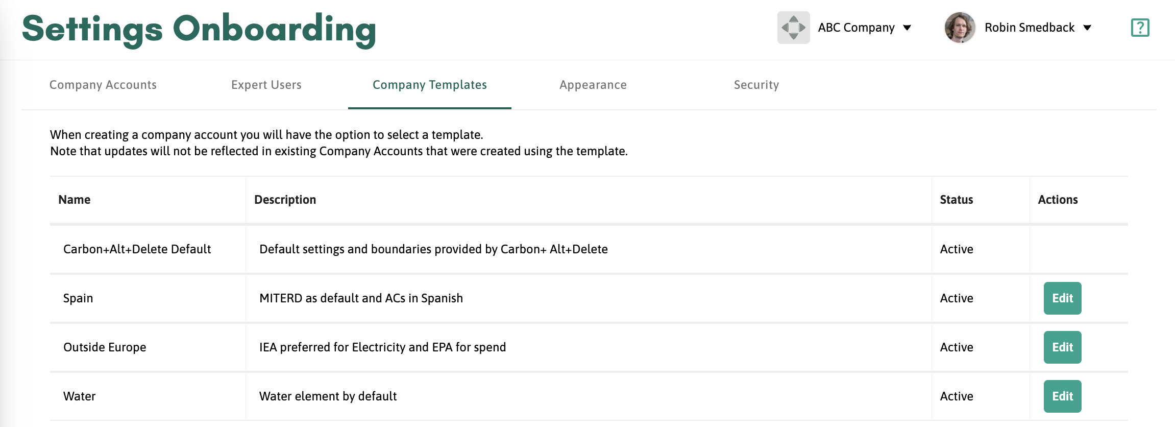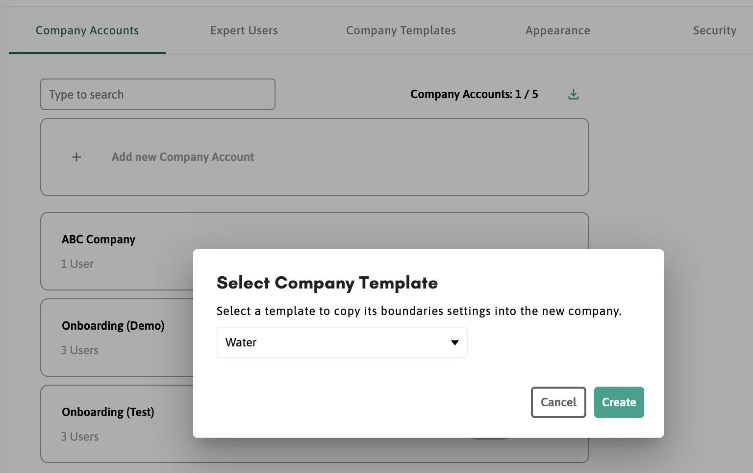 Now that your template is ready, you can create a new company account using the same boundary settings as your template. When you create a new company account, you will now be asked to choose from one of your own templates or the Carbon+Alt+Delete default. You then treat it the same as any other company by giving it a name and giving access to it for your Expert and Company Users.