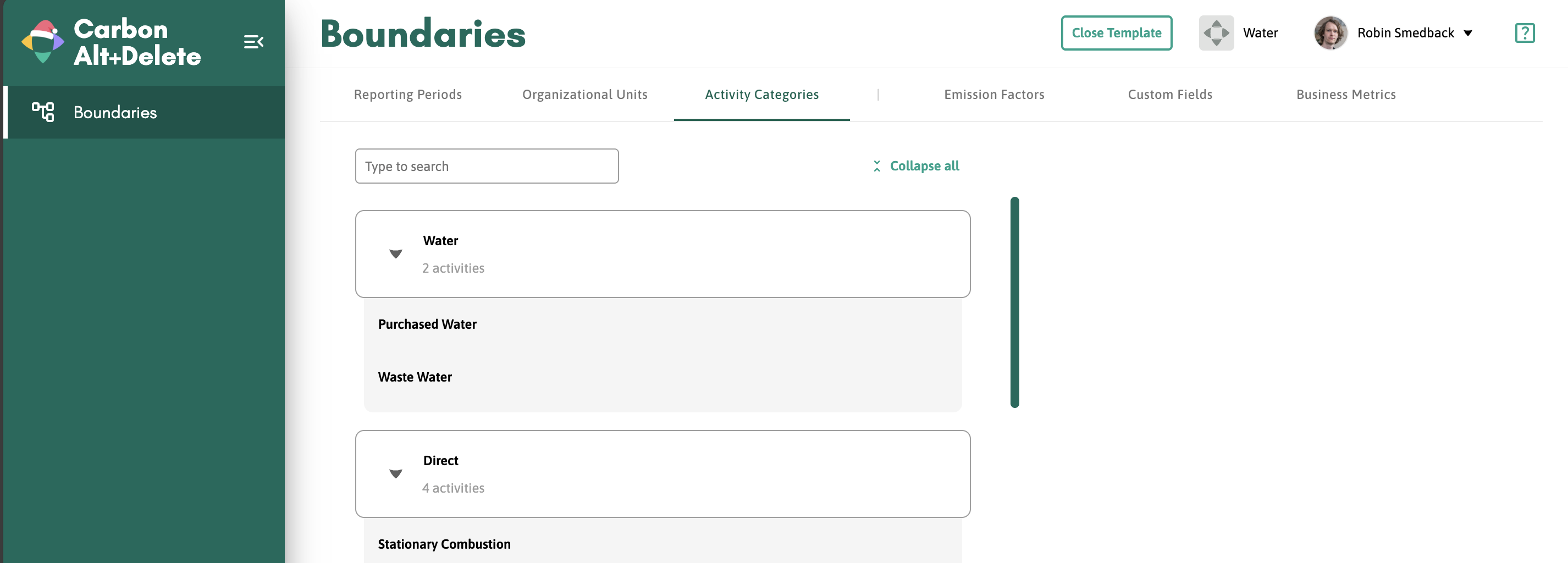 You can change everything under Reporting Periods, Organizational Units, Activity Categories, Emission Factors, Custom Fields, and Business Metrics. Once you are done setting up the boundaries of this template, you click Close Template to save the changes you have made and to return to the previously accessed company.